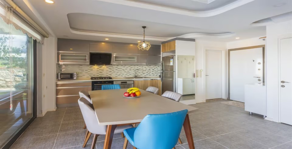 Mutfak: Açık planlı mutfak, 8 kişi ve daha fazla kişiye yetecek kadar mutfak malzemeleri, buzdolabı, fırın, ocak, mikrodalga fırın, bulaşık makinesi, çamaşır makinesi, tost makinesi, kettle ve çaydanlık bulunmaktadır..