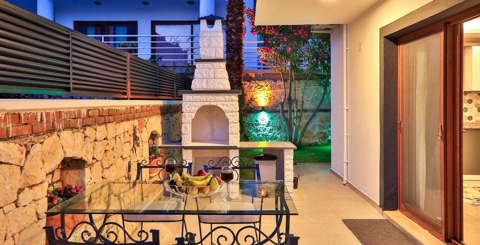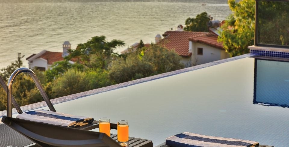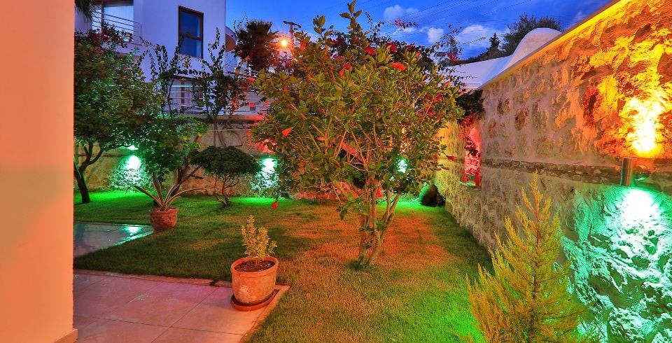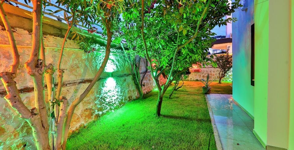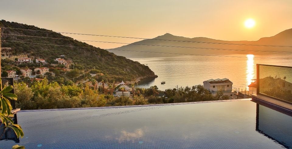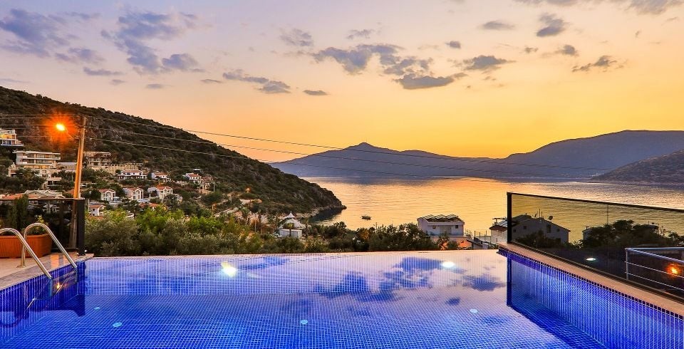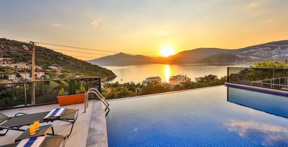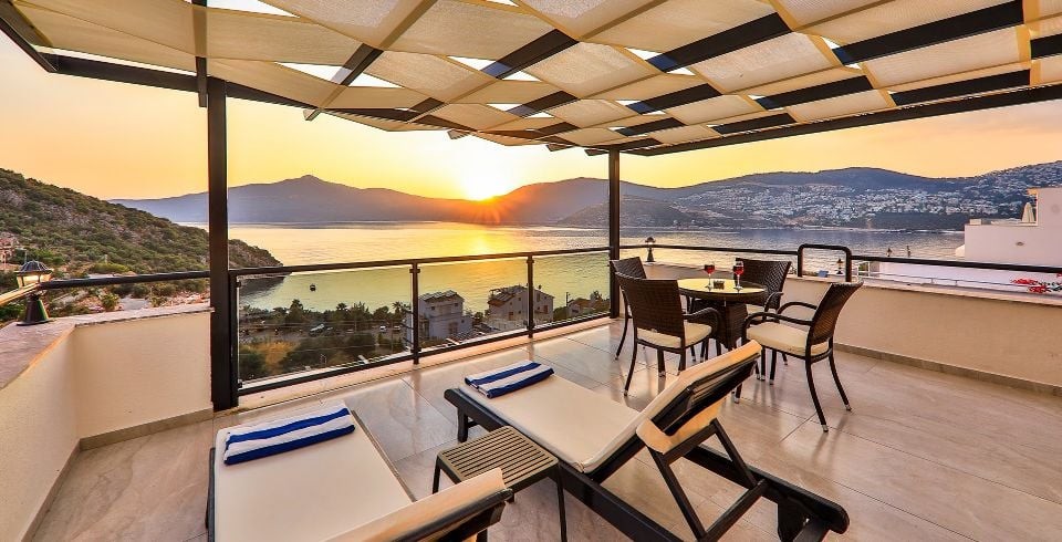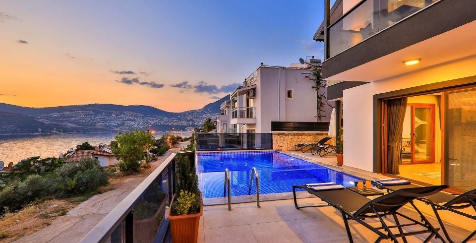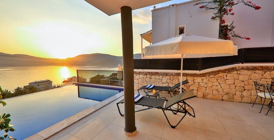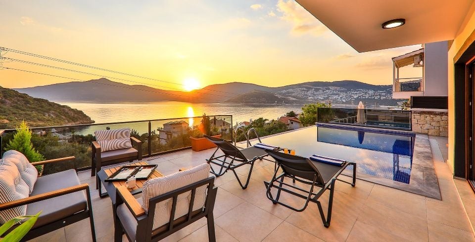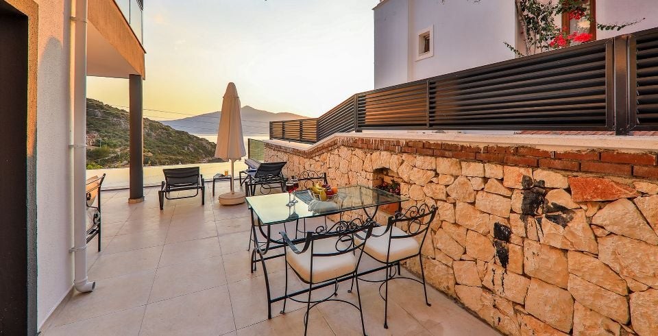 Villanın dış alanı, sonsuzluk havuzu, şezlonglar, oturma grubu, barbekü ve yemek masasıyla keyifli vakit geçirmeniz için tasarlanmıştır. Bahçesinde ise çeşitli ağaçlarla çevrili geniş bir alan yer alır. Kalkan’ın büyüleyici gün batımlarını izleyebileceğiniz teras alanı, tatilinize romantik bir atmosfer katar.