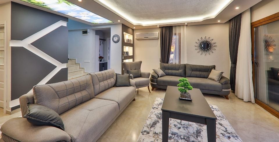Salon: Villamızın salon katı geniş ve ferah bir yapıda olup içerisinde oturma grubu, klima, LCD TV, uydu alıcısı, modem ve yemek masası bulunmaktadır. Salon katından havuz terasına direk çıkış vardır. Villamızın bir alt katında bulunan diğer salonunda oturma grubu, TV ünitesi, TV ve langırt bulunmaktadır.