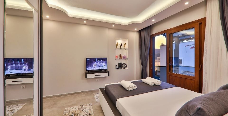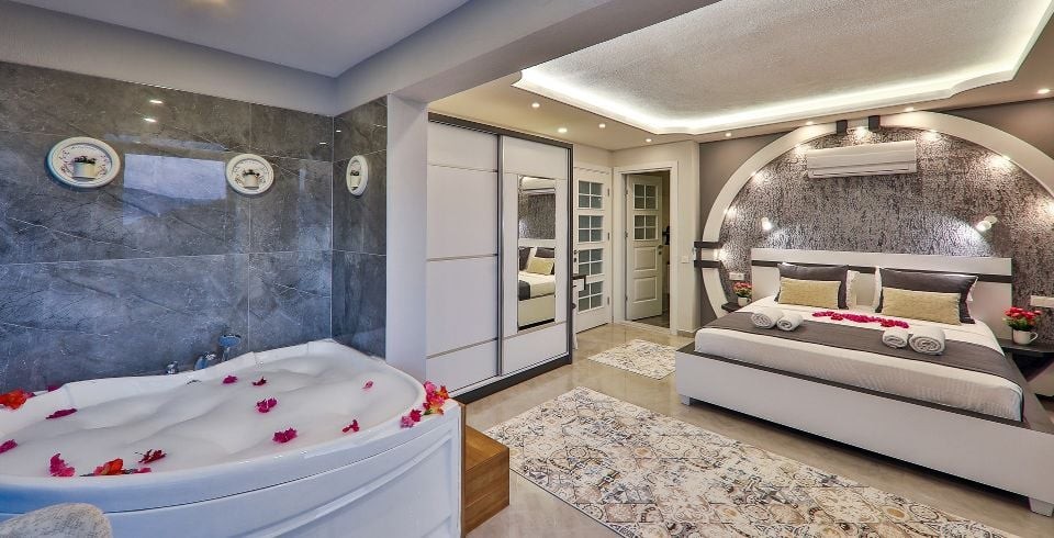 Toplam 3 yatak odası ve 6 kişilik konaklama kapasitesi ile geniş aileler ve karışık arkadaş grupları için ideal bir seçenektir. Villanın ebeveyn odasında, panoramik manzaraya karşı konumlandırılmış jakuzili özel banyo yer alır. Diğer yatak odaları da klimalı, ferah ve özenle dekore edilmiştir. Salon bölümü geniş cam kapılarla havuz terasına açılırken, modern Amerikan mutfak; buzdolabı, bulaşık makinesi, fırın, mikrodalga, kettle ve yemek takımlarıyla eksiksiz donanıma sahiptir.