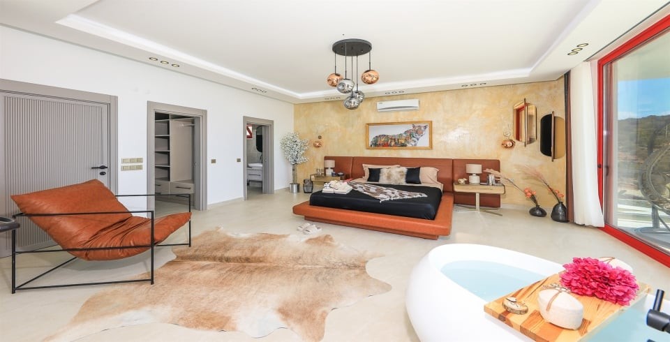 1. Yatak Odası : 1 adet çift kişilik yatak, giyinme odası, makyaj masası, komodin, klima , ebeveyn banyo , küvet ve tv bulunmaktadır. (balkonda özel 2 kişilik oturma grubu)