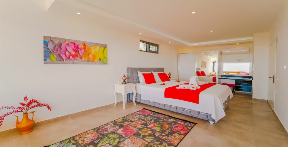 Yatak Odası: 1 adet çift kişilik yatak, klima, elbise dolabı, makyaj masası, komodin, jakuzi bulunmaktadır.