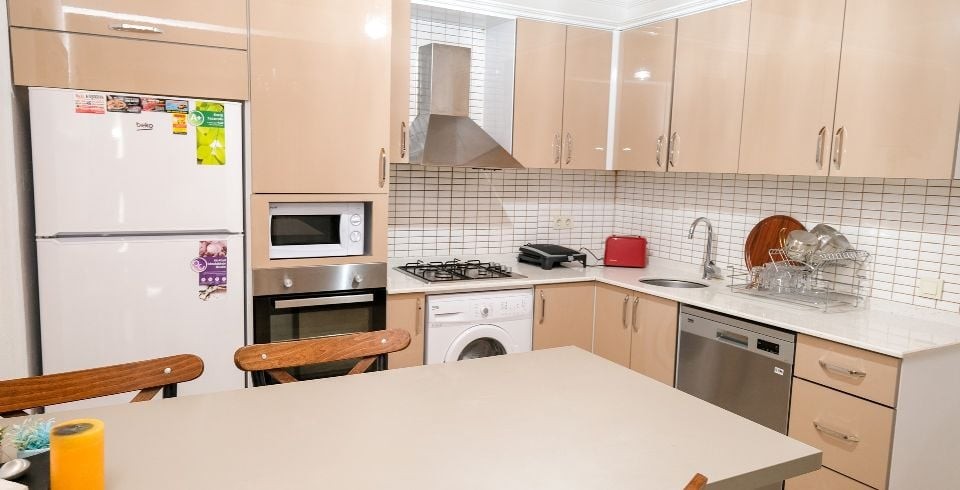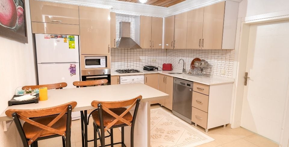 Mutfak : Villamızın geniş Amerikan mutfağı ile sizlere kendi evinizin mutfağı gibi hissettirecek. Ayrıca mutfakta klima, bulaşık makinası, buzdolabı, çamaşır makinası, mikrodalga fırın, ekmek kızartma, su ısıtıcısı, fırın, 4'lü ocak seti ve 4 kişilik geniş yemek masası ile tava tencere vb. mutfak araç gereçlerini kullanma fırsatını sizlere sunuyoruz.