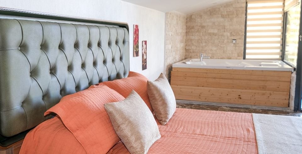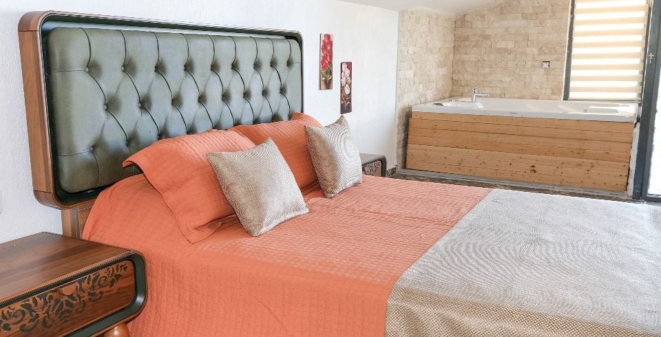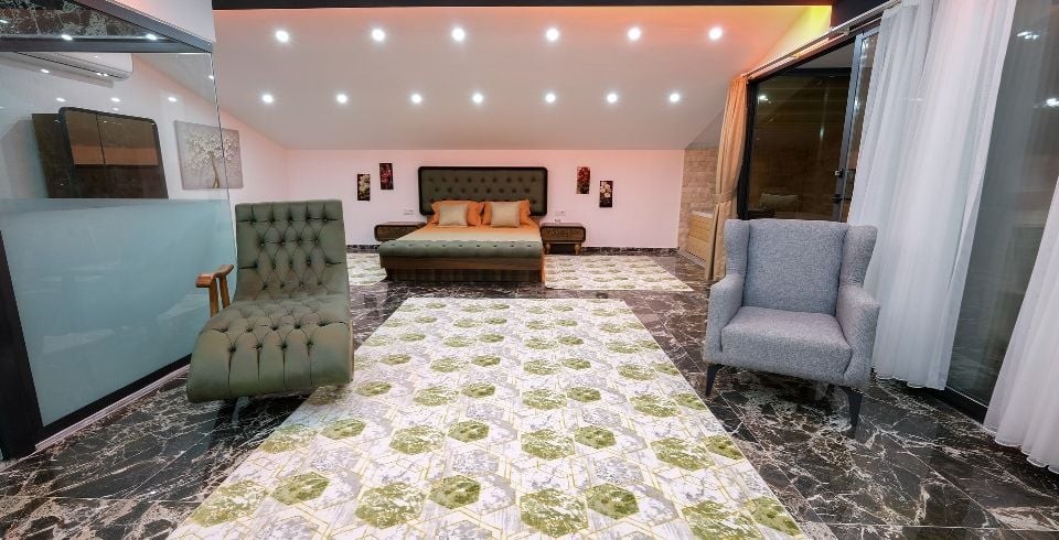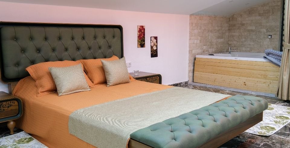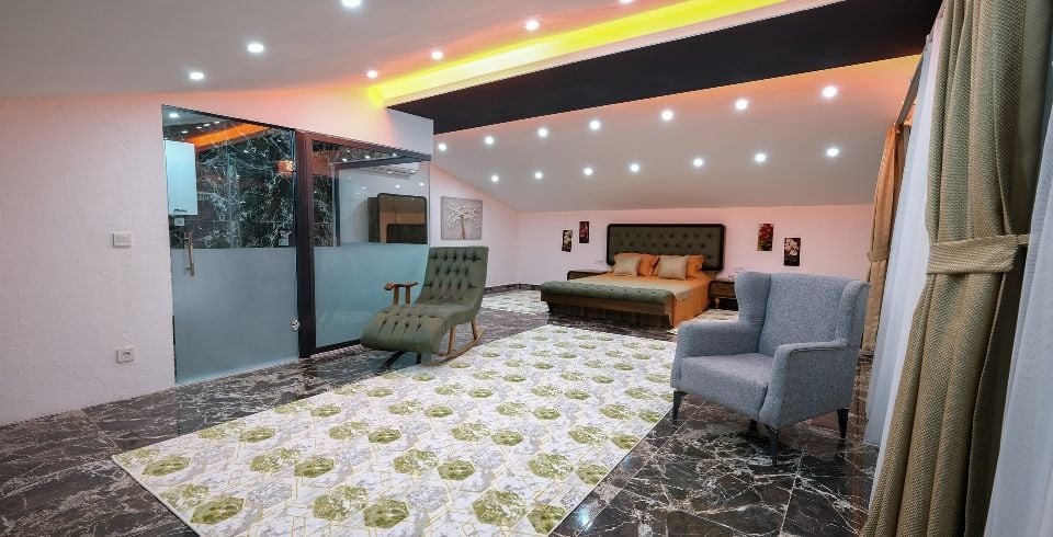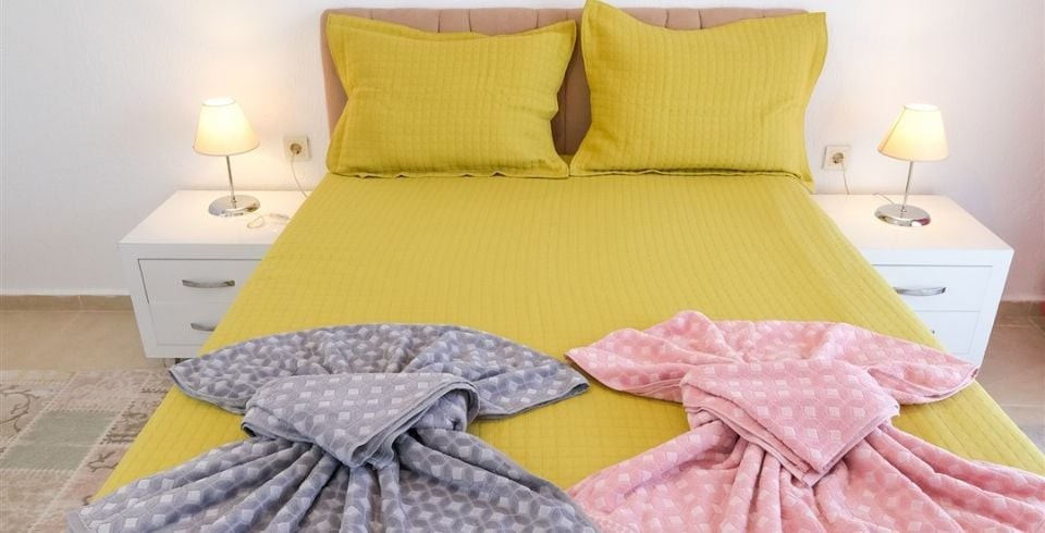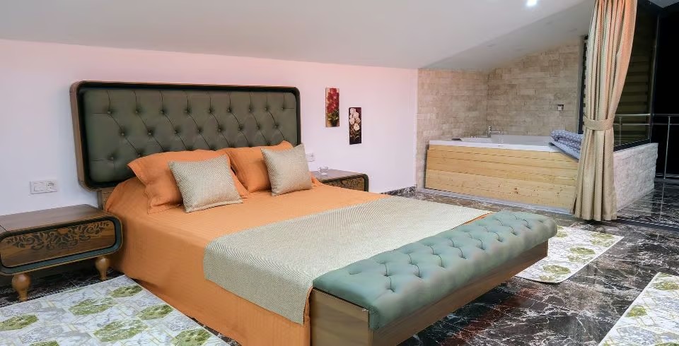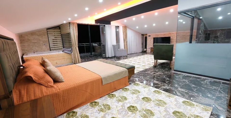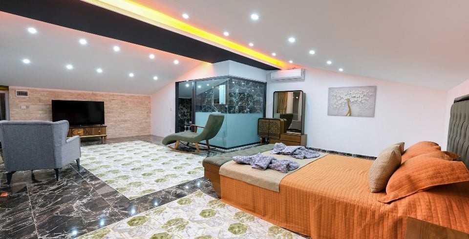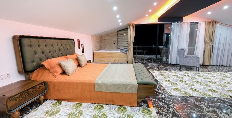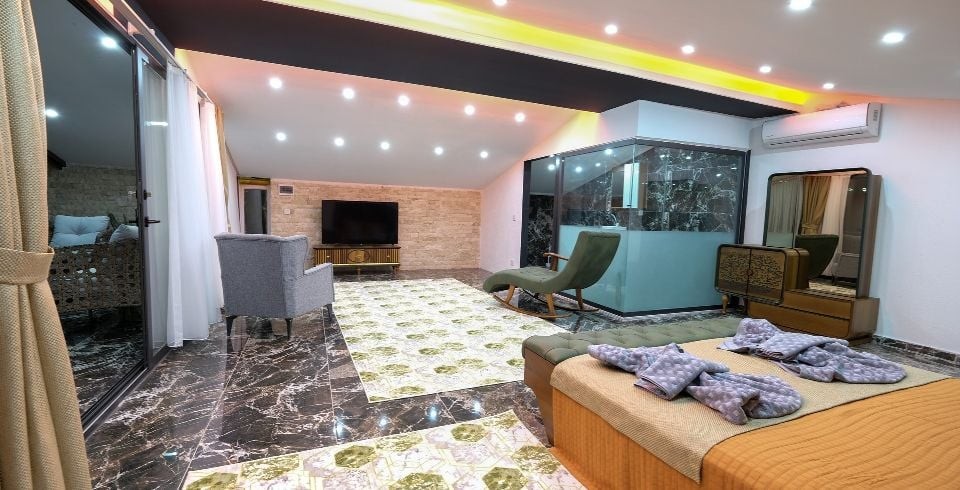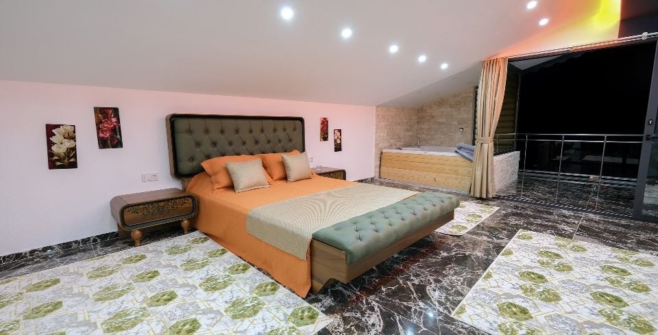 2. Yatak Odası : İki kişilik yatak, klima ile terası da bulunmaktadır. Elbise dolabı, makyaj masası, komodin, banyo ve lavabodan oluşmaktadır. Yatak odamızda jakuzi vardır.
