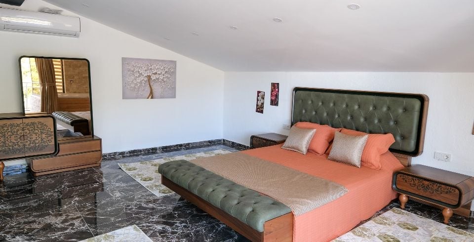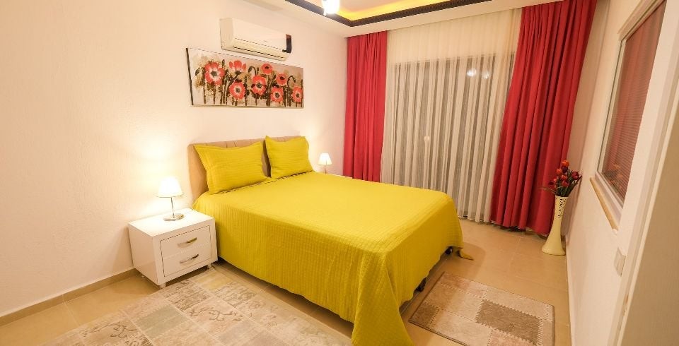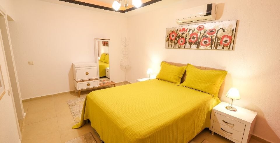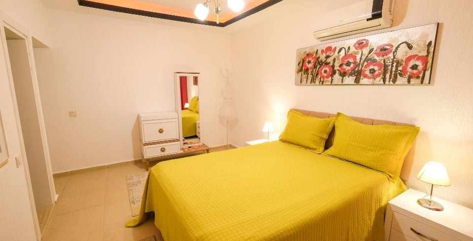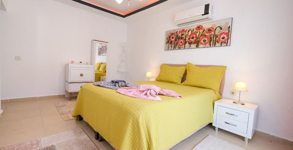 1. Yatak Odası : İki kişilik yatakla beraber sizleri sıcak yaz günlerinde serin tutması için bakımları yapılmış klima ile terası da bulunmaktadır. Elbise dolabı, makyaj masası, komodin, banyo ve lavabodan oluşmaktadır. Yatak odamızda jakuzi vardır.