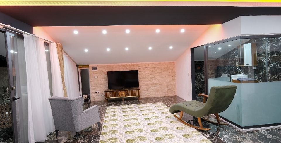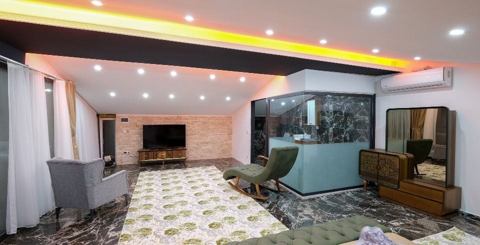 Salon : Villamızın salonunda sizi şık bir oturma grubu ile klima, TV, internet, uydu, ütü, ütü masası, koltuk, sehpa ile ferah bir salon bekliyor olacaktır. Havuz terasına çıkış yapılmaktadır.