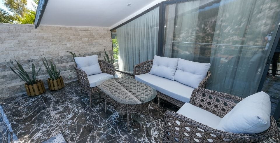 Bahçe : Villamızın bahçesinde özel yüzme havuzu, güneşlenmeniz için tane şezlong, güneşlenme terası, 4 kişilik masa, salıncak, kamelya, oturma grubu, mangal keyfiniz için barbekü, güneş şemsiyesi bulunmaktadır.