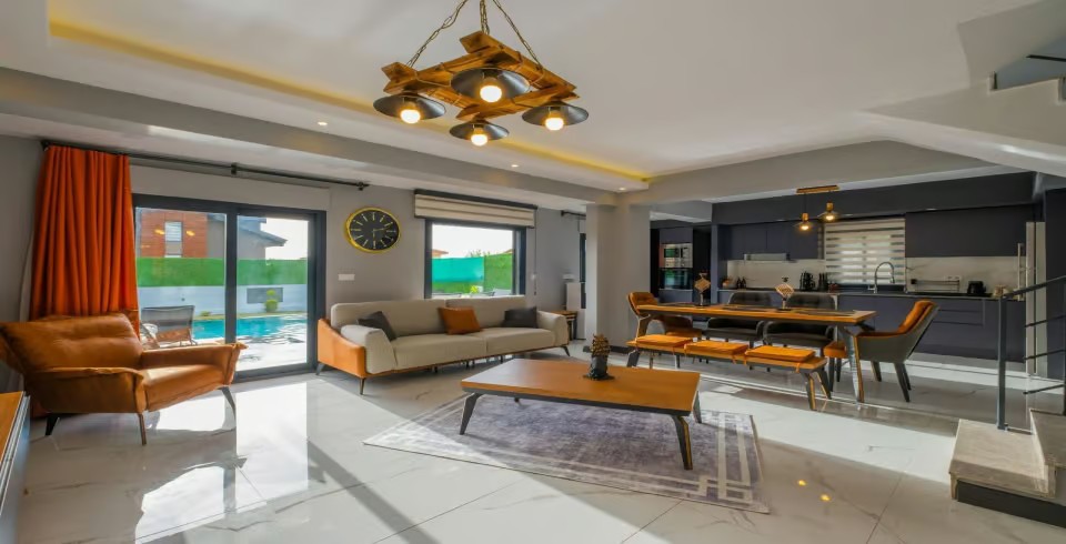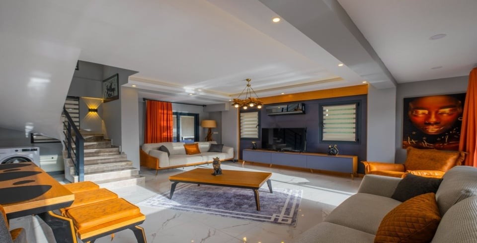 Salon: Özenle döşenmiş salon, modern koltuklar, 8 kişilik yemek masası, LCD TV ve klima bulunmaktadır.