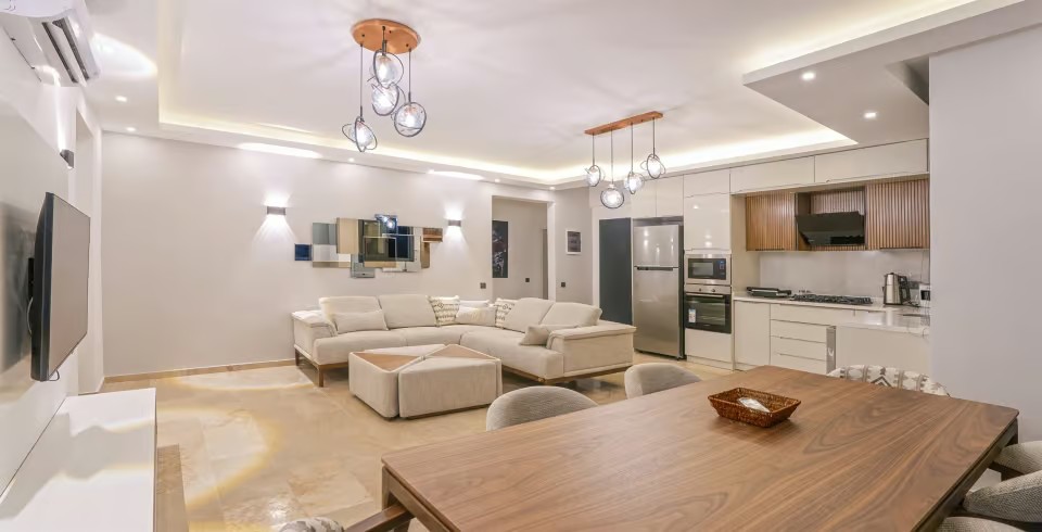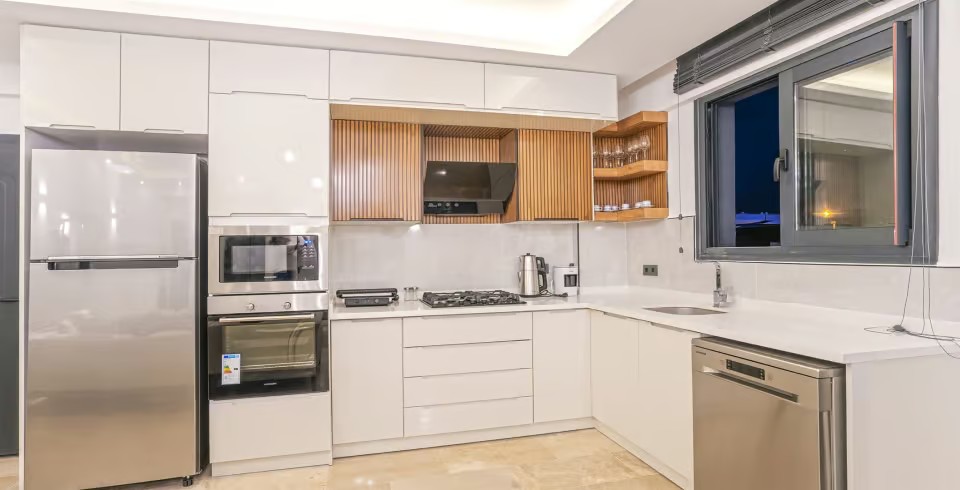 Mutfak: Bulaşık makinesi, çatal kaşık takımı, buzdolabı, tost makinesi mikrodalga fırın, çamaşır makinesi, ankastre fırın, elektrikli su ısıtıcı, ekmek kızartma makinesi tava ve tencere takımı,  yemek takımı ve yemek masası bulunmaktadır.