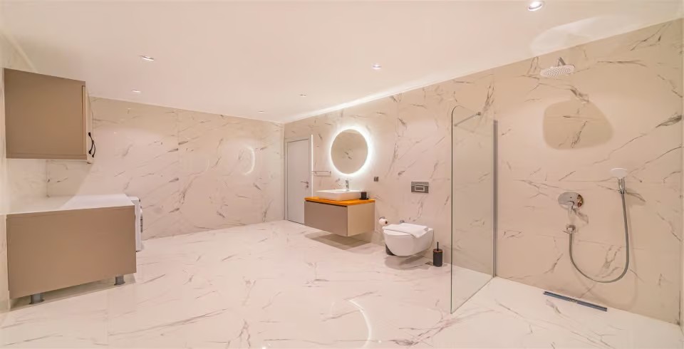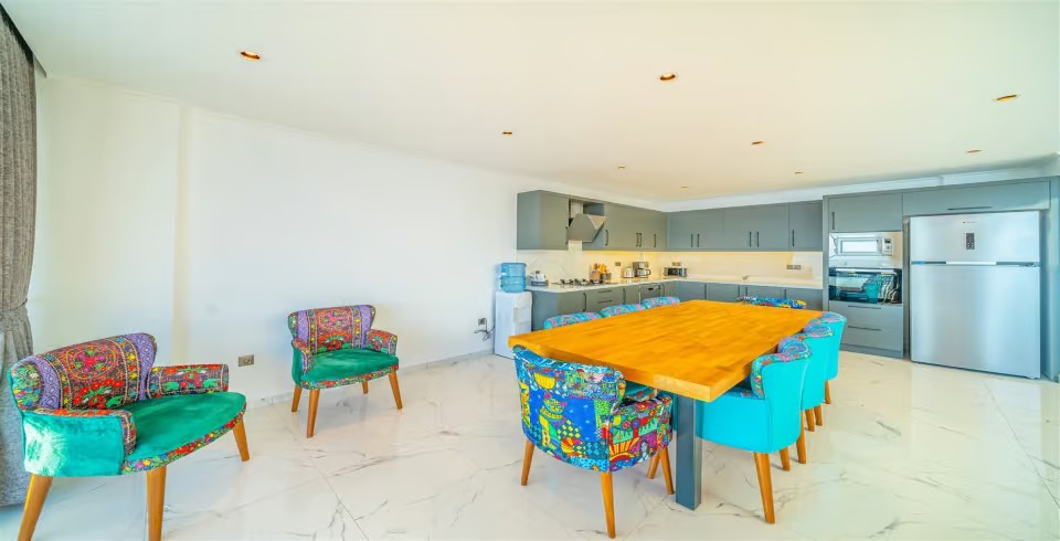 Salon : Salon içerisinde oturma grubu, TV, klima, sehpa bulunmaktadır. Havuz terasına çıkış yapılabilmektedir.