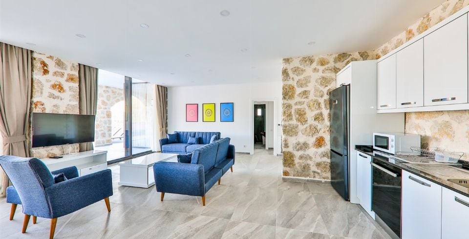 Salon: Havuz başına çıkış, oturma grubu, uydu alıcı, TV, klima, lavabo, ütü, ütü masası, havuz kenarına çıkış ve kablosuz modem bulunmaktadır.