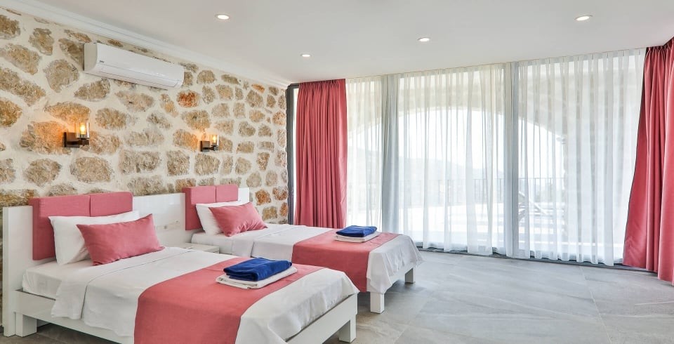 1. Yatak Odası: Tek kişilik 2 adet yatak, elbise dolabı, komodin, makyaj masası, klima, banyo ve tuvalet bulunmaktadır.