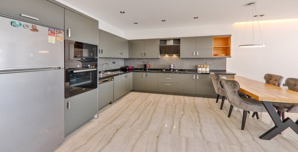 Mutfak : Amerikan açık mutfak ve salona sahip villamızın mutfağında buzdolabı, bulaşık makinası, ankastre ocak, fırın, mikrodalga, 4'lü ankastre ocak, kettle, çamaşır makinası, yemek masası ve mutfak araç ve gereçleri bulunmaktadır.