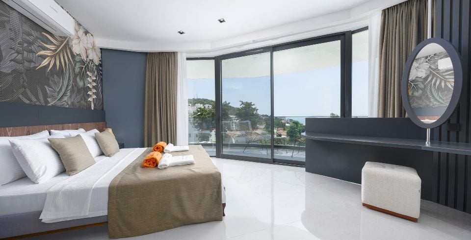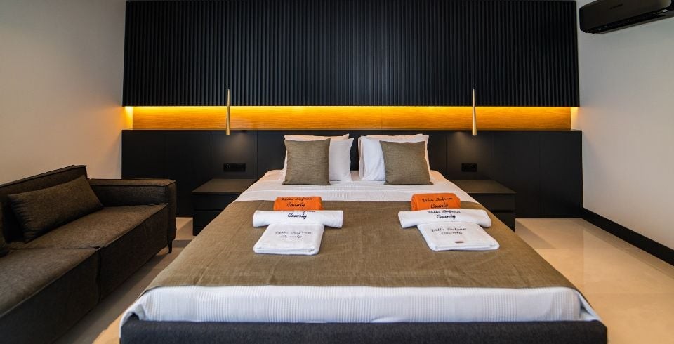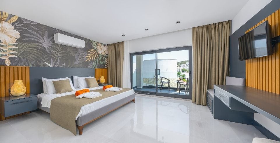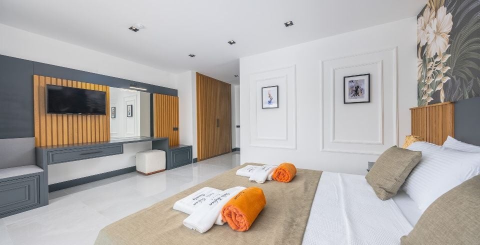 5 Yatak Odası : Bir adet çift kişilik yatak, klima, komodin, elbise dolabı, TV, jakuzi,  banyo ve tuvalet yer almaktadır.