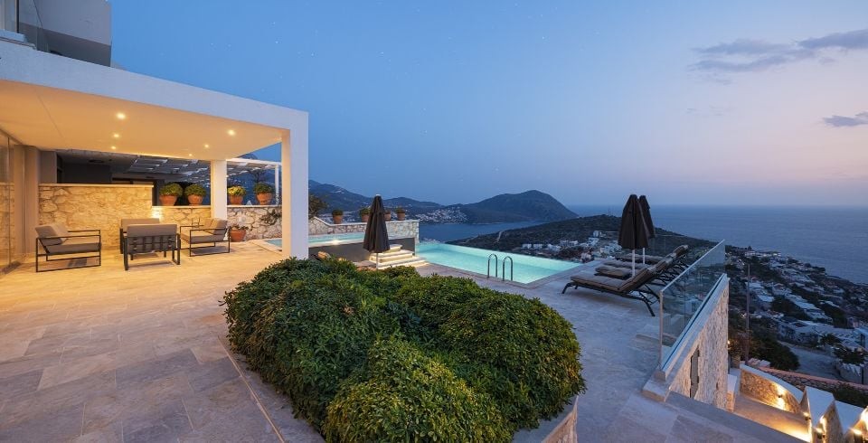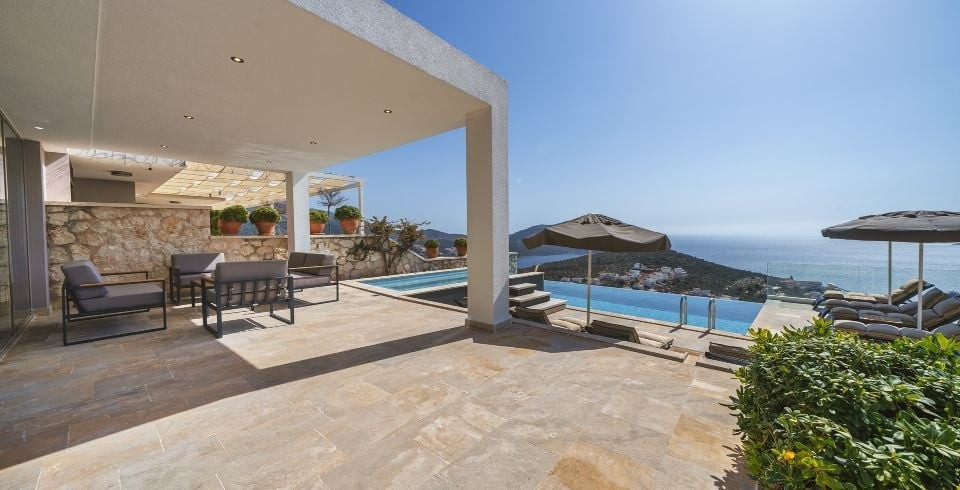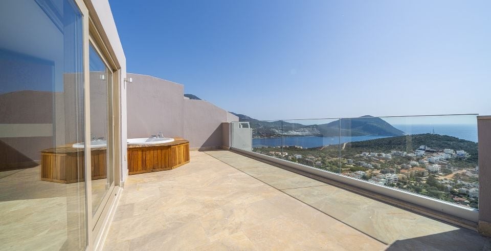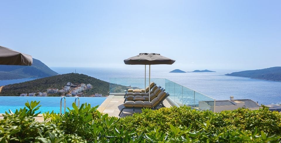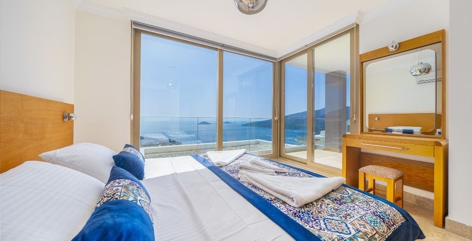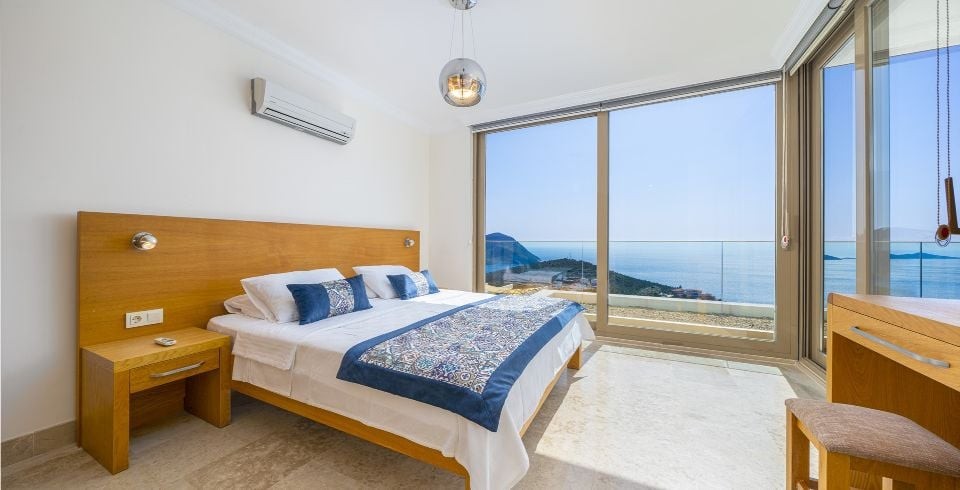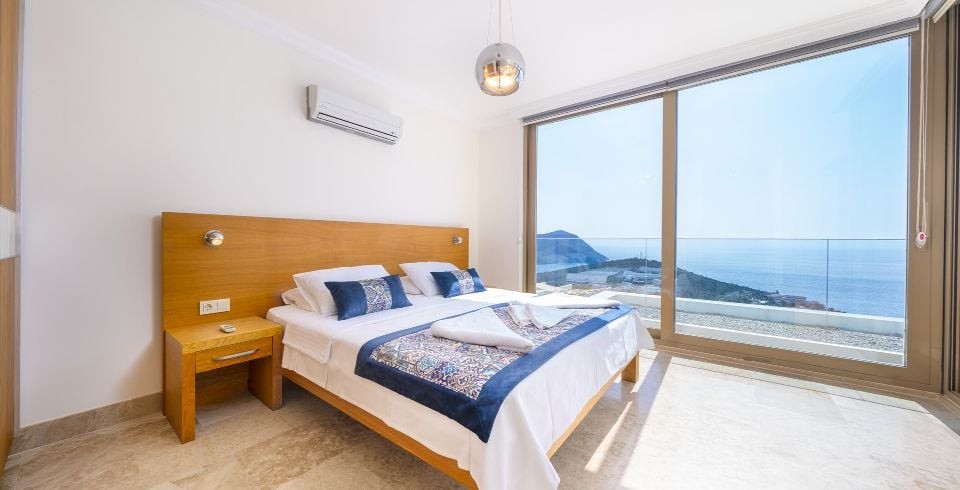 Villa Safran View, Kalkan’ın Kalamar bölgesinde panoramik deniz ve ada manzarası sunan, 4 yatak odalı, 4 banyolu ve 8 kişilik bir lüks villadır. Üst katlardaki yatak odaları geniş cam cepheleriyle gün ışığı alırken, alt kat misafirleri için havuz bölgesinin altında ayrı girişli bir oda mevcuttur. Ana odada çift kişilik yatak ve özel jakuzili balkonuyla manzaranın keyfini çıkarırken; diğer odalar yine konforlu ve klima donanımlıdır.
