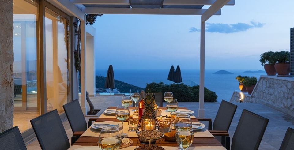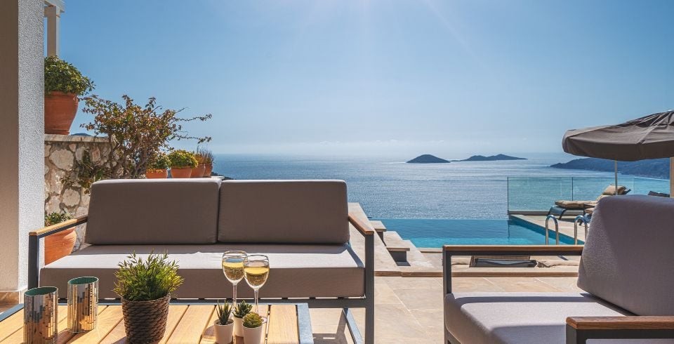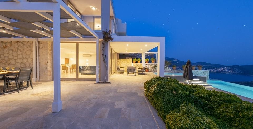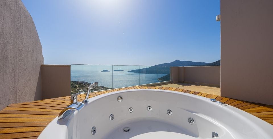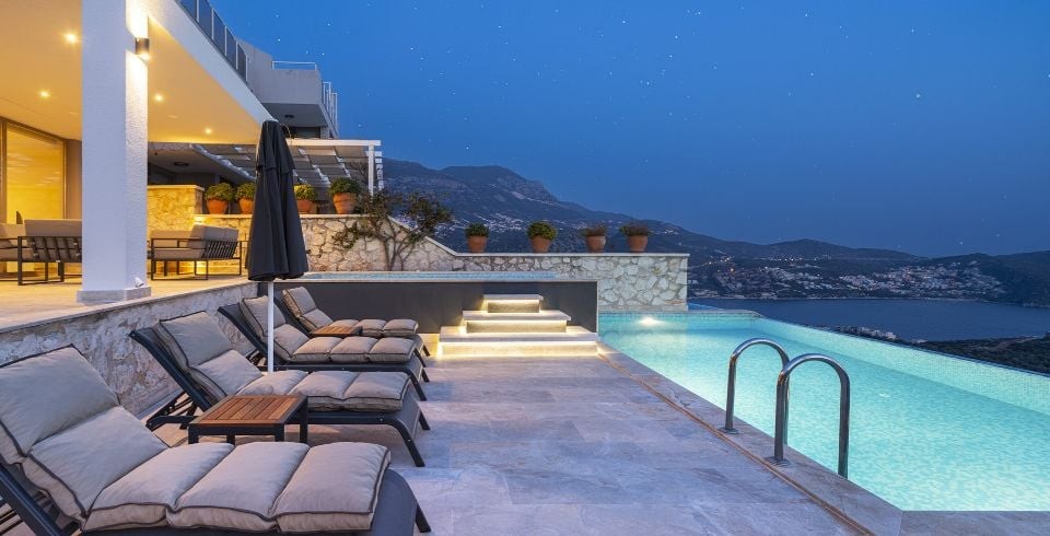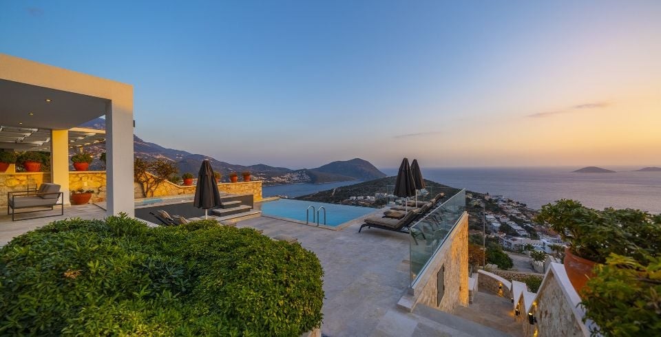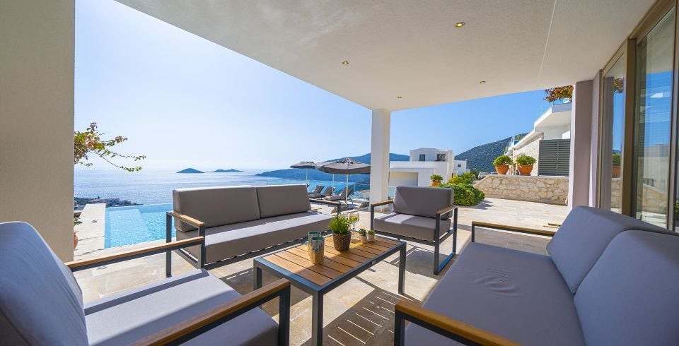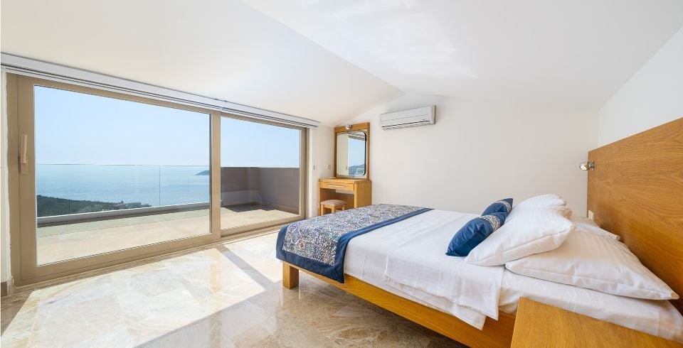 Villa Safran View, Kalkan’ın Kalamar bölgesinde panoramik deniz ve ada manzarası sunan, 4 yatak odalı, 4 banyolu ve 8 kişilik bir lüks villadır. Üst katlardaki yatak odaları geniş cam cepheleriyle gün ışığı alırken, alt kat misafirleri için havuz bölgesinin altında ayrı girişli bir oda mevcuttur. Ana odada çift kişilik yatak ve özel jakuzili balkonuyla manzaranın keyfini çıkarırken; diğer odalar yine konforlu ve klima donanımlıdır.