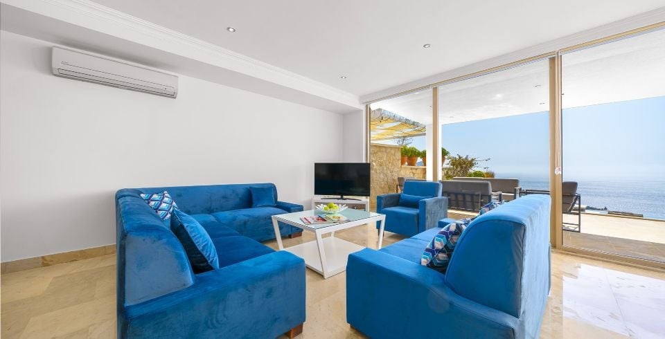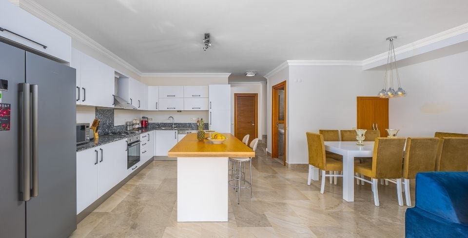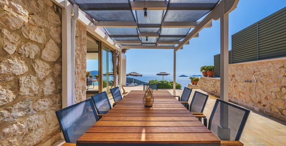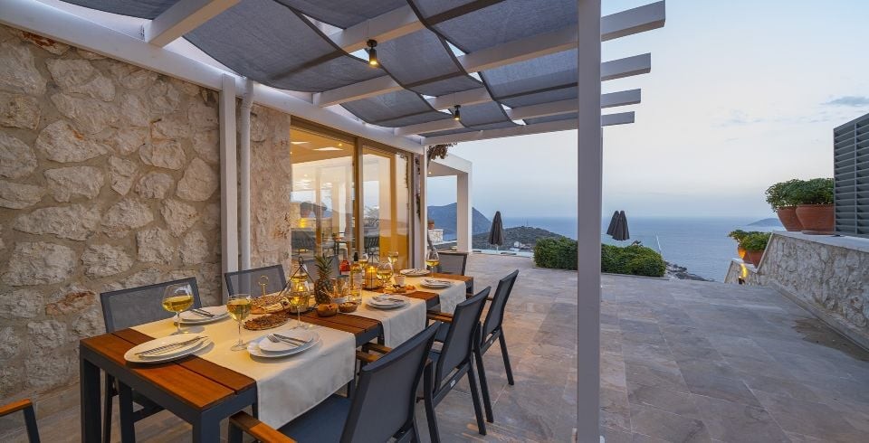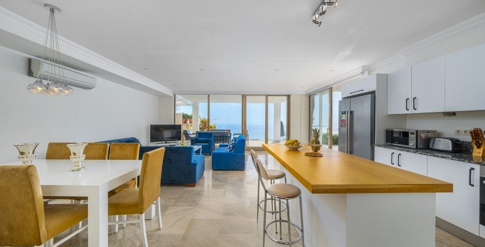 Açık plan salon ve tam donanımlı Amerikan mutfak ile ferah bir yaşam alanı sunar. Mutfakta fırın, ocak, bulaşık makinesi, buzdolabı ve tüm temel gereçler bulunmaktadır. Dış alanda özel sonsuzluk havuzu, jakuzi bölümü, teras şezlongları, gölgelik alan, barbekü ve yemek masası yer alır. Bahçe terasa açılan alanlar doğayla iç içe dinlenme için ideal bir atmosfer sağlar.