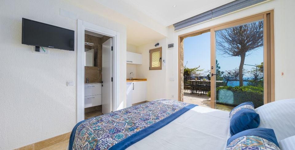 2. Yatak Odası : Süit yatak odası çift kişilik yatak, elbise dolabı, makyaj masası, komodin, klima, teras, banyo ve lavabo bulunmaktadır.