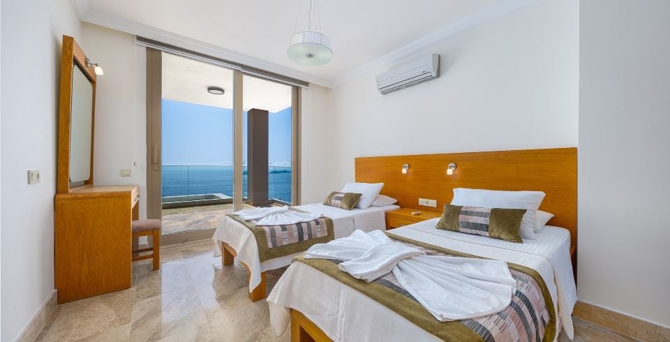 4. Yatak Odası : Süit yatak odası tek kişilik 2 yatak, klima, makyaj masası, komodin, elbise dolabı banyo ve lavabo bulunmaktadır.