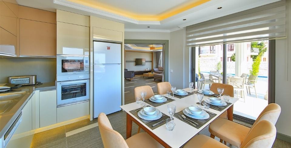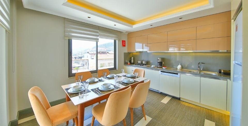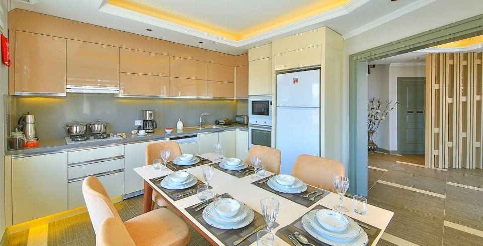 Mutfak :  Amerikan Mutfak , buzdolabı, bulaşık makinası, yemek masası, ankastre fırın, mikrodalga fırın, 4 ' lü ocak, tost makinası, elektrikli su ısıstıcısı, yemek takımı, çatal bıçak seti, tavalar, tencereler, bardaklar bulunmaktadır.