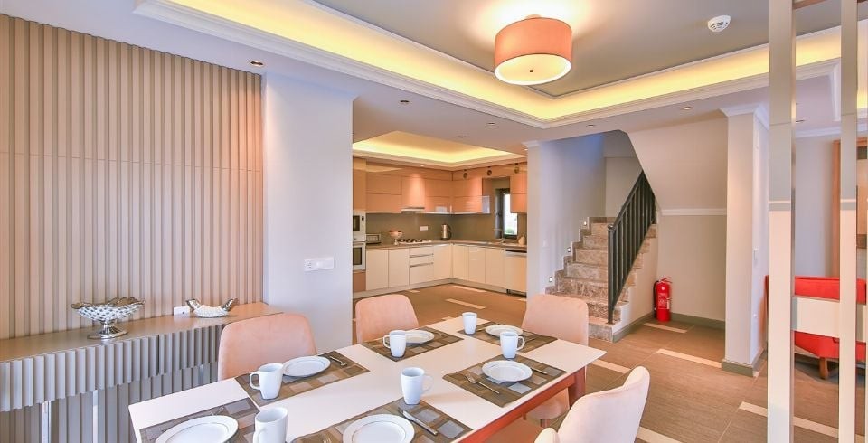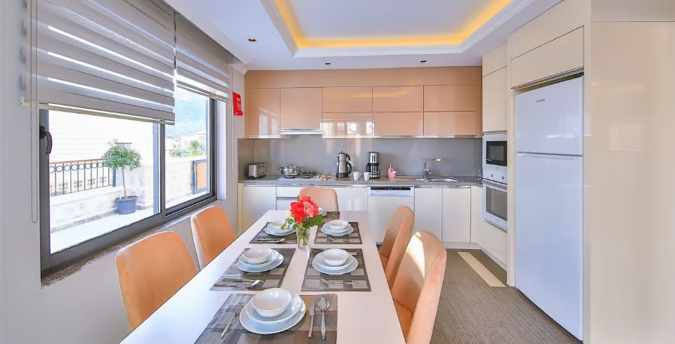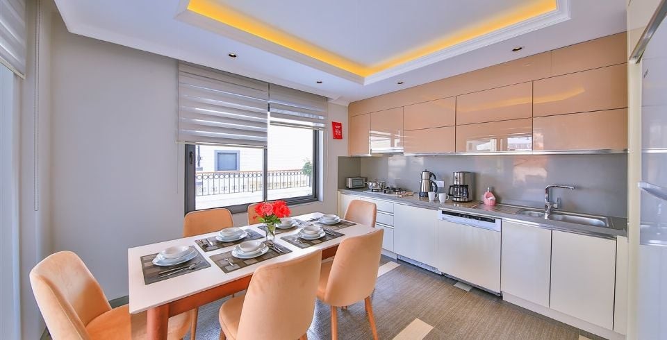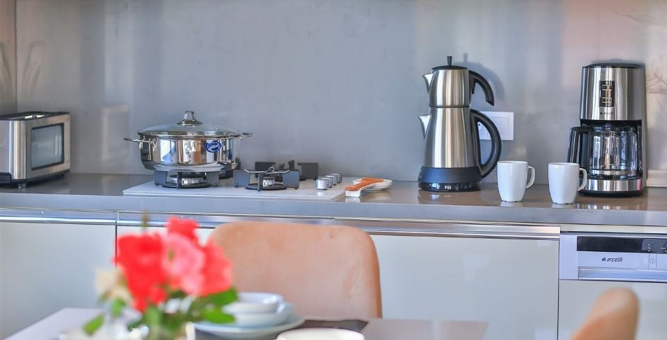 Mutfak : Amerikan Mutfak, buzdolabı, bulaşık makinası, yemek masası, ankastre fırın, mikrodalga fırın, 4 ' lü ocak, tost makinası, elektrikli su ısıtıcısı, yemek takımı , çatal bıçak seti, tavalar, tencereler, bardaklar bulunmaktadır.