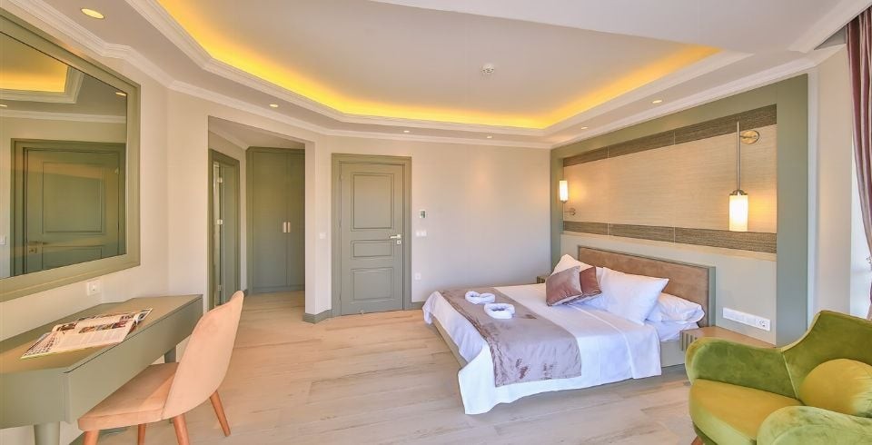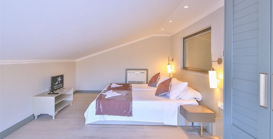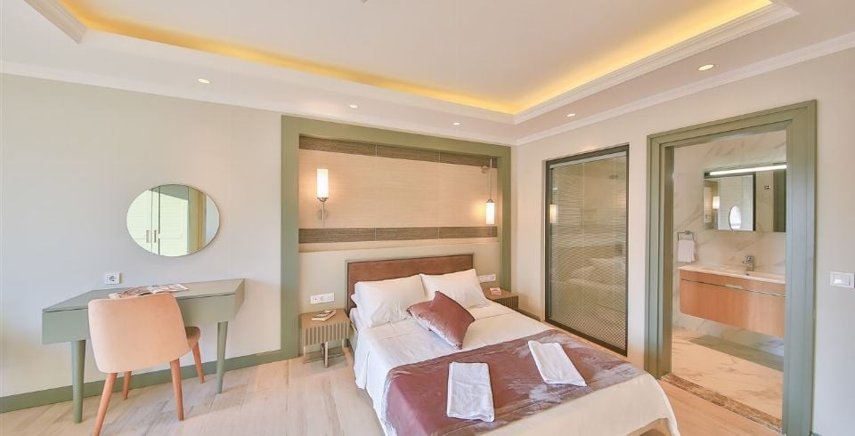 Havuz ve Bahçe : Yata Odası Kiralık yazlık villamızın özel yüzme havuzu ve havuz terasında Şezlonglar, güneş şemsiyesi, mangal, yemek masası ve sandalyeler bulunmaktadır.