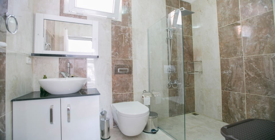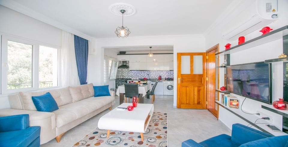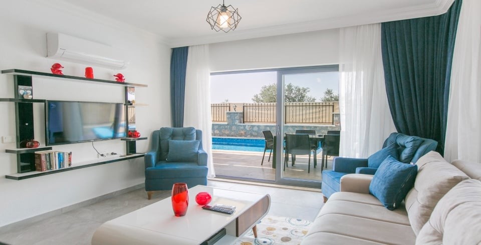 Salon : Salon içerisinde oturma grubu, TV, klima, sehpa bulunmaktadır. Havuz terasına çıkış yapılabilmektedir.