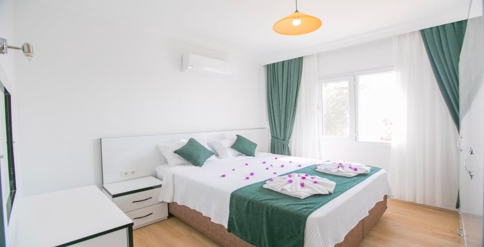 2. Yatak Odası : 1 adet çift kişilik yatak, klima, elbise dolabı, makyaj masası, banyo ve tuvalet ortak kullanımdır.