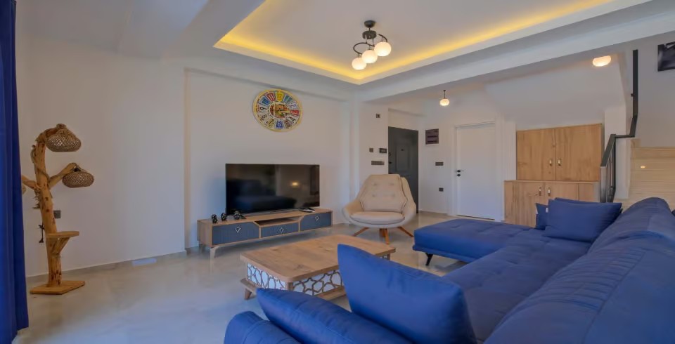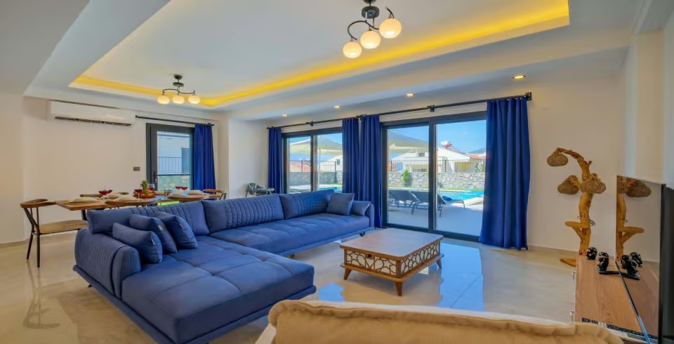 Salon : Villanın eşsiz havuz manzarasını seyredebileceğiniz bu salonda lüks bir oturma odası, TV, sehpa, yemek masası, lavabo ve tuvalet yer almaktadır. Ayrıca salondan havuz terasına çıkış mevcuttur.