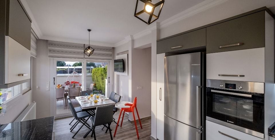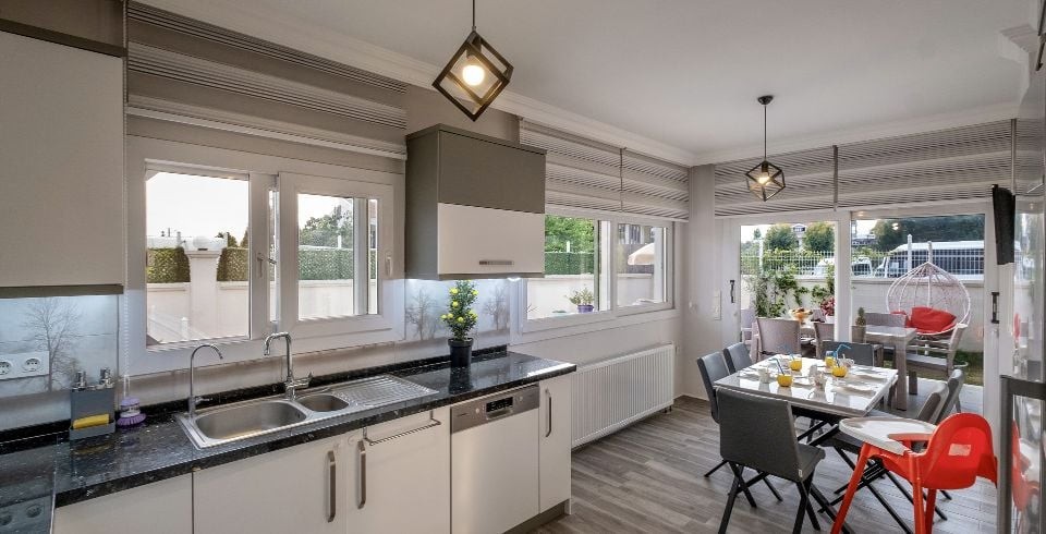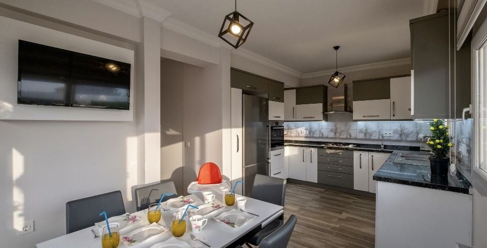 Mutfak : Amerikan mutfak tarzında tasarlanmış mutfakta, yemek masası sandalyeler, buzdolabı, bulaşık makinesi, çamaşır makinesi, 4’lü ocak, mikrodalga fırın, ankastre, fırın, kettle, su sebili, yemek takımı, tencere vb. mutfak ekipmanları mevcuttur.