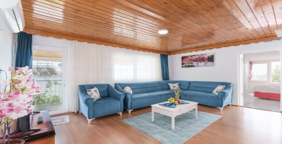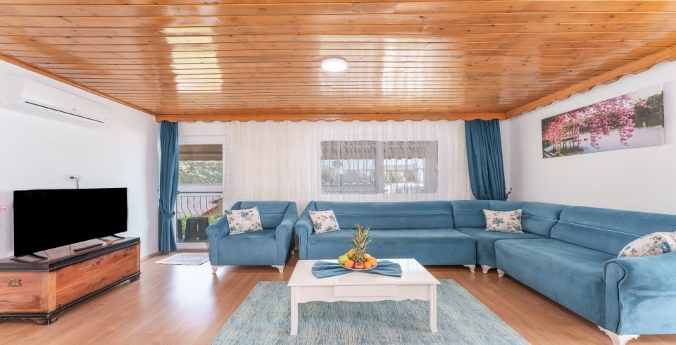 Salon: Özenle döşenmiş salon, modern koltuklar, 6 kişilik yemek masası, LCD TV ve klima bulunmaktadır.