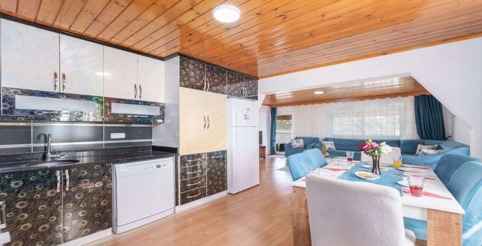 Mutfak: Açık planlı mutfak, 6 kişiye yetecek kadar mutfak malzemeleri, buzdolabı, fırın, ocak, mikrodalga fırın, bulaşık makinesi, çamaşır makinesi, tost makinesi, kettle ve çaydanlık bulunmaktadır..