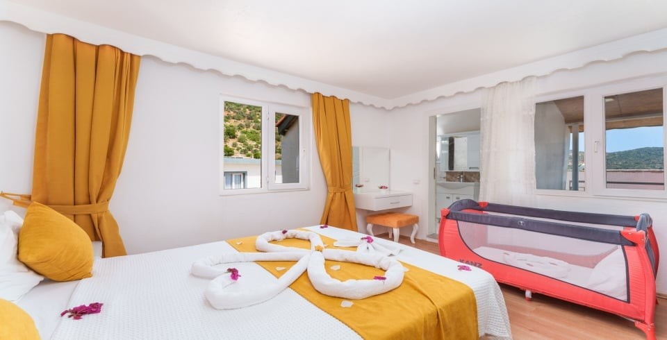 2.Yatak Odası: 1 adet çift kişilik yatak, elbise dolabı, makyaj masası, komodin, klima, banyo ve lavabo bulunmaktadır.