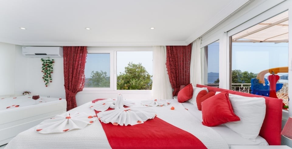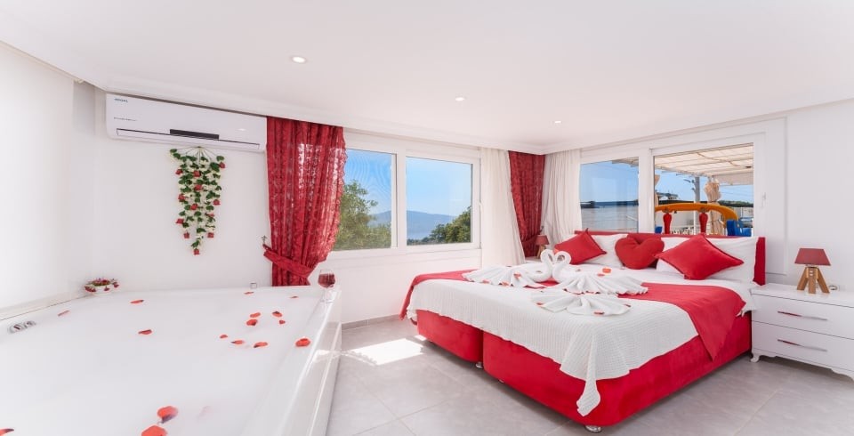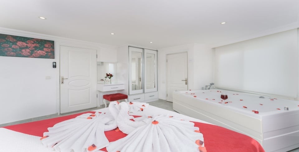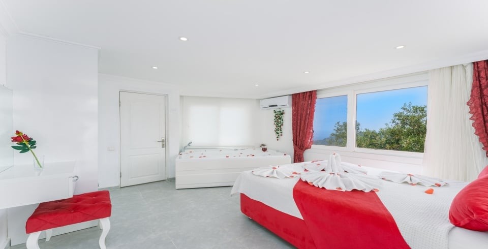 1.Yatak Odası: 1 adet çift kişilik yatak, elbise dolabı, komodin, klima, makyaj masası, jakuzi, banyo ve lavabo bulunmaktadır.