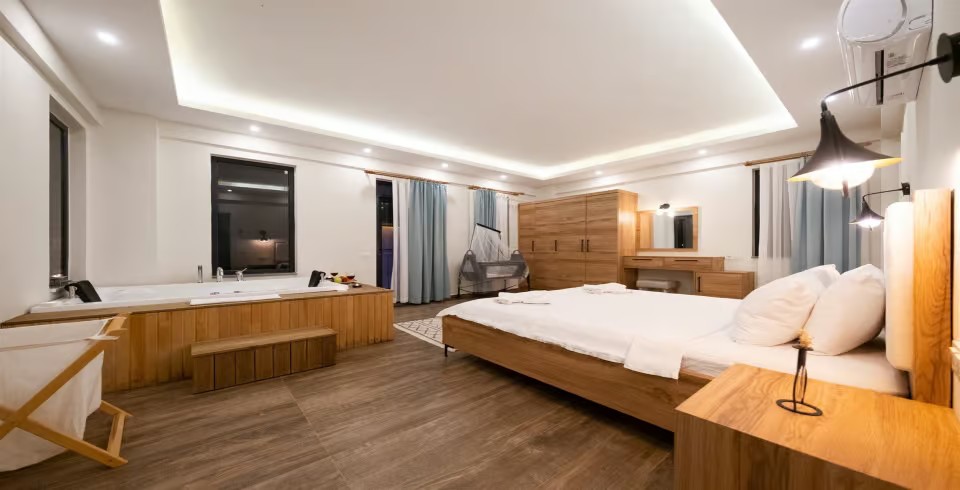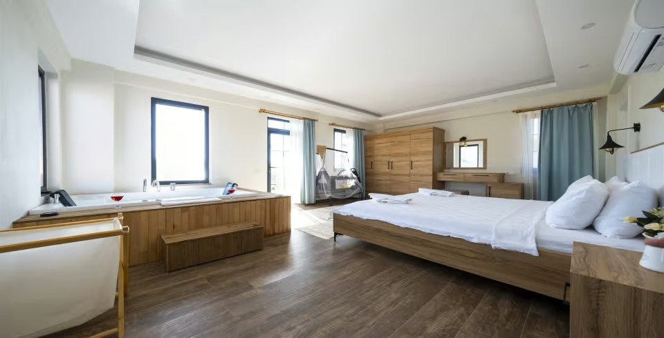 1. Yatak Odası : 1 adet çift kişilik yatak, klima, jakuzi, komodin, elbise dolabı, makyaj masası, banyo ve lavabo bulunmaktadır.