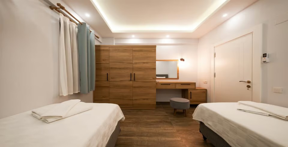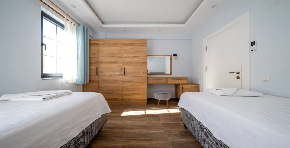 2. Yatak Odası : 2 adet tek kişilik yatak, klima, elbise dolabı, makyaj masası, komodin, banyo ve lavabo bulunmaktadır.