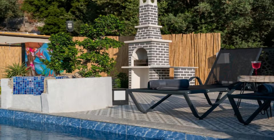 Havuz ve Bahçe :Özel yüzme havuzu, şezlong, şemsiye, sehpa, yemek masası, sandalyeler ve barbekü (mangal) bulunmaktadır.