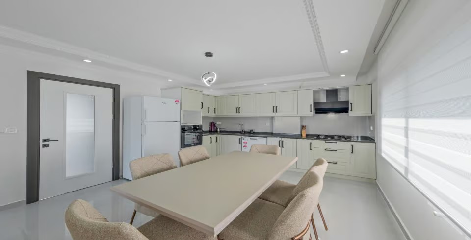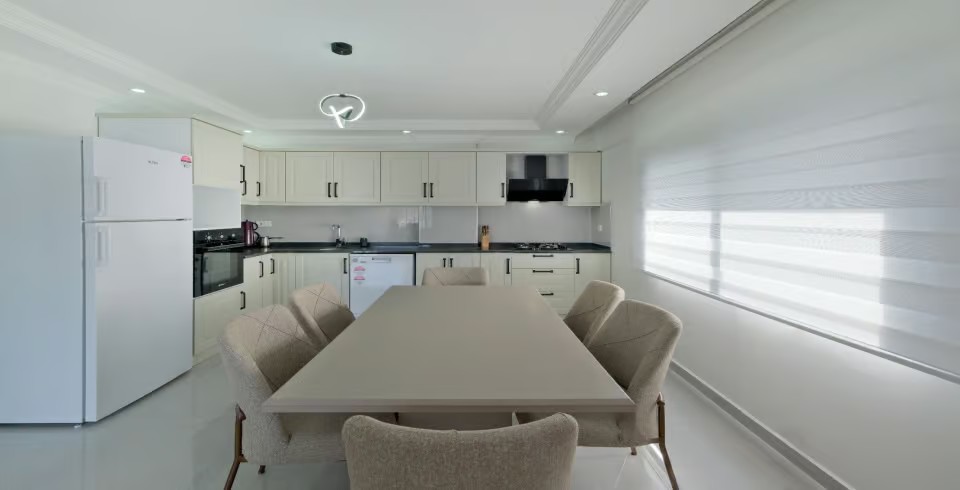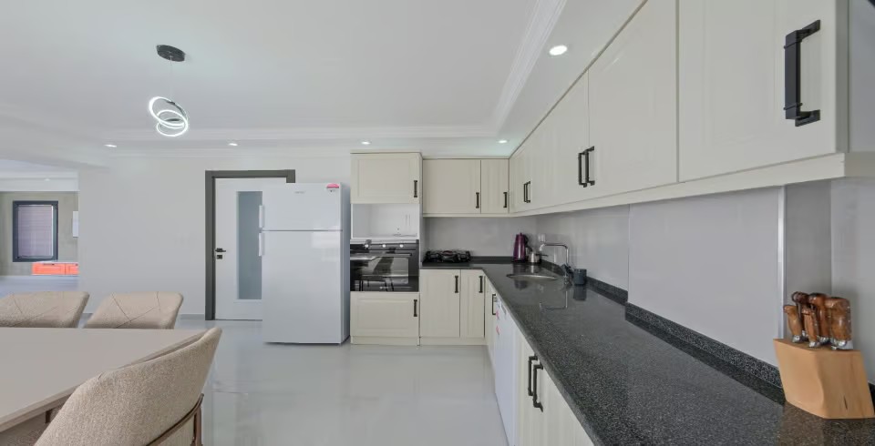 Mutfak: Amerikan mutfak, bulaşık makinası, buzdolabı, ankastre fırın, ankastre 4’lü ocak, su ısıtıcısı, tencere ve tava takımı, yemek takımı, kaşık çatal bıçak takımı, bardak takımı, yemek masası, sandalyeler, çamaşır makinesi. bulunmaktadır.