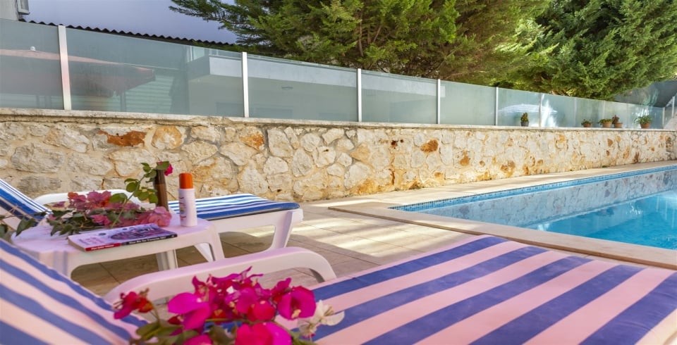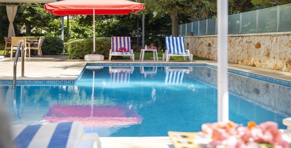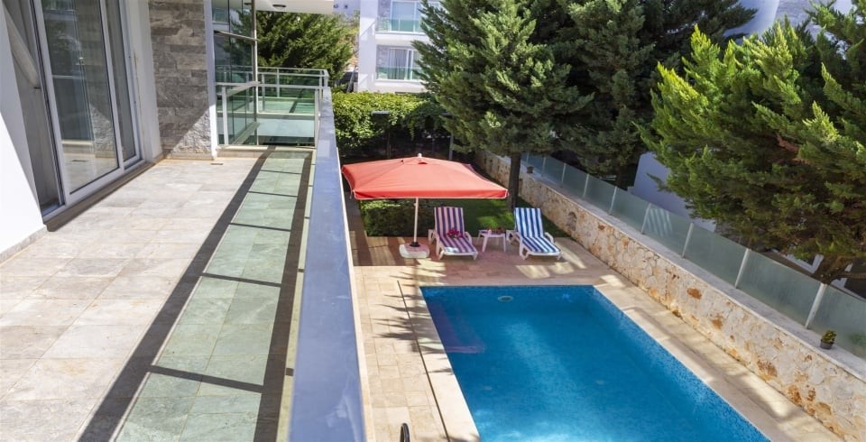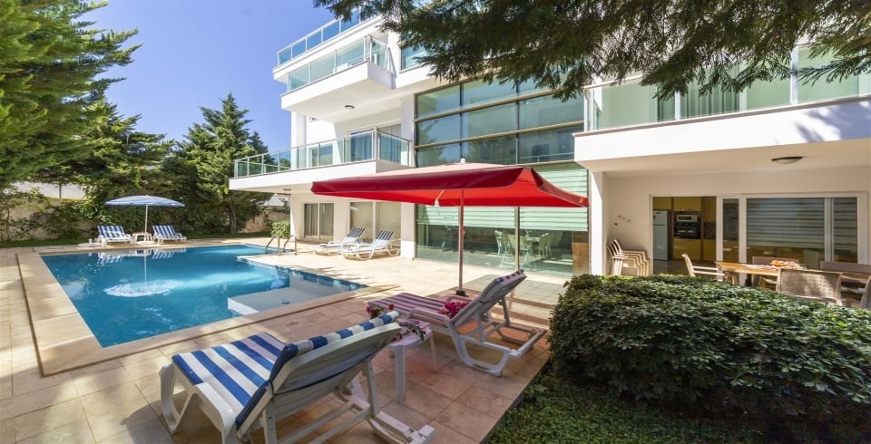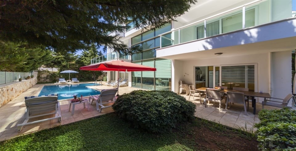 Bahçe ve Bahçe : Villamız özel bahçesinde özel yüzme havuzu, güneşlenme terası, şezlong, güneş şemsiyesi, bahçe masası ve sandalyeler, taş barbekü, çardak, duş ve tenis masası bulunmaktadır. Havuz ve bahçe bakımı her gün düzenli olarak görevliler tarafından yapılmaktadır.