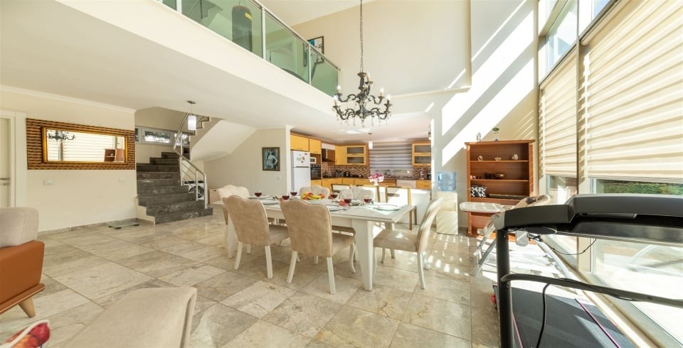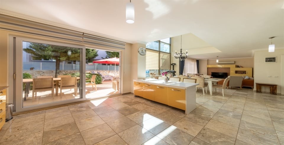 Salon : Salonda masa ve sandalyeler, LCD, TV, uydu alıcı, ses sistemi, DVD player, oturma grubu, ütü ve ütü masası, lavabo, kablosuz modem, elektrik süpürgesi, lavabo ve tuvalet bulunmaktadır. Salondan havuz kenarına çıkış vardır.