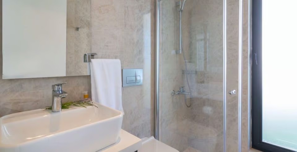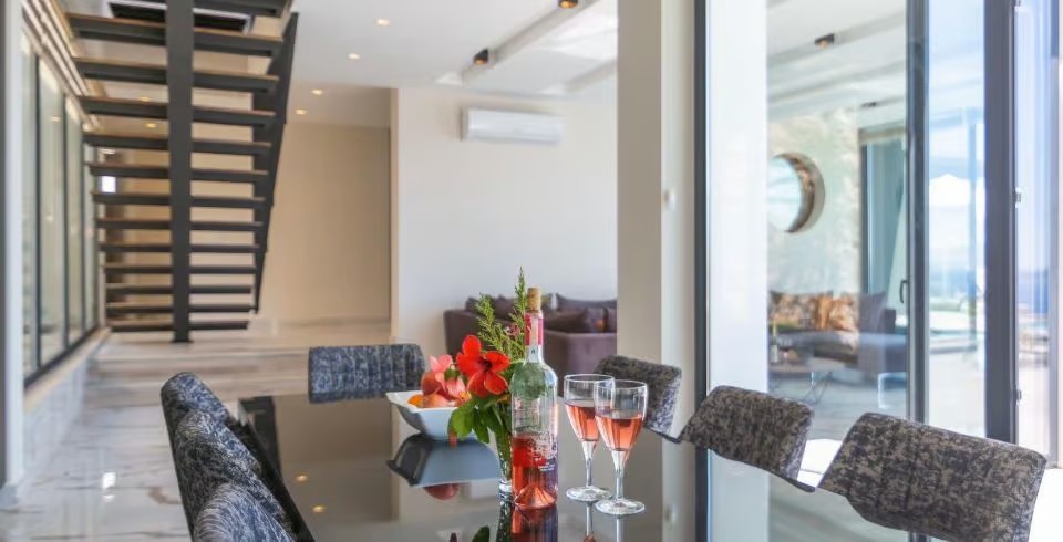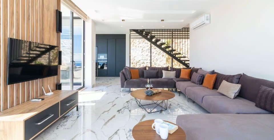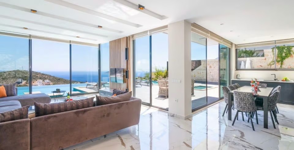 Salon : Kiralık Villamız Deniz manzaralı salonunda oturma grubu, plazma TV, uydu alıcısı, klima, yemek masası, ütü ve ütü masası, havuz terasına çıkış bulunmaktadır.