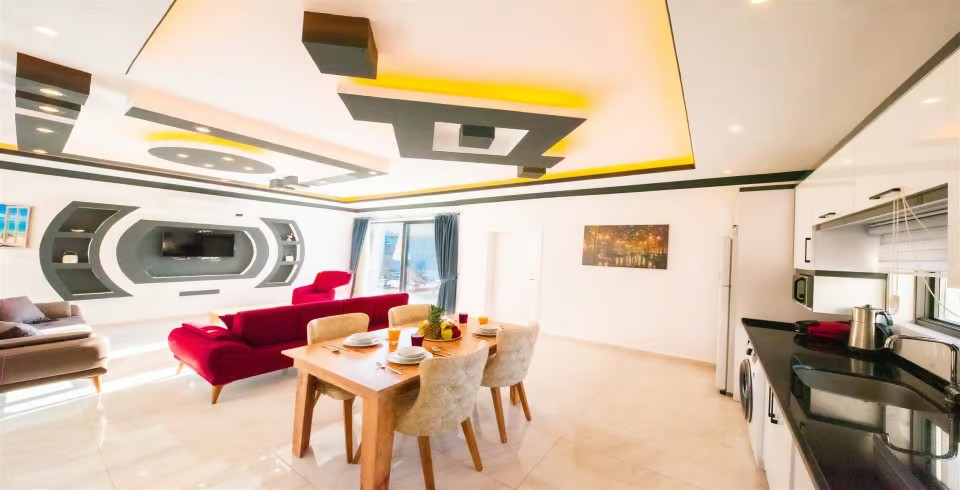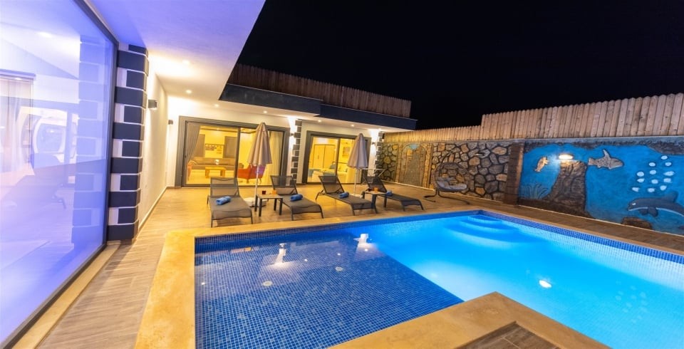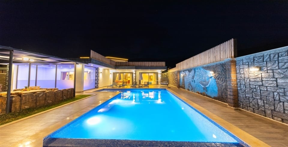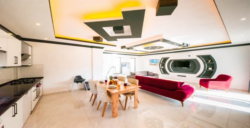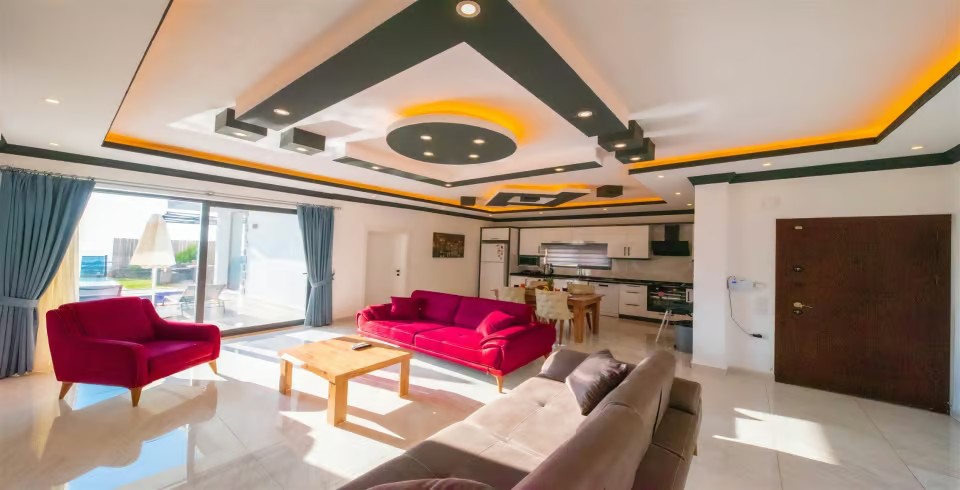 Salon : Villamızın iç dizaynı da son modaya uygun olarak modern bir şekilde tasarlanmıştır. Çeşitli dekoratif eşyalarla süslediğimiz salonumuz havuzlu bahçeye açılıyor. Villa salonunda oturma grubu, TV, internet, klima, sehpa bulunmaktadır.
