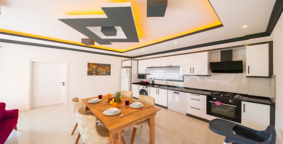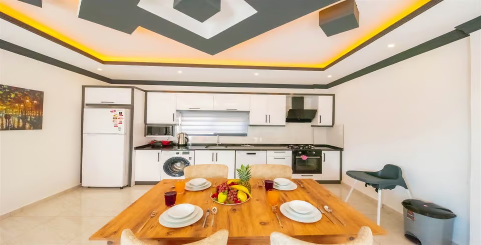 Mutfak : Modern Amerika mutfağımızda 4 kişilik yemek masası, buzdolabı, çamaşır makinesi, mikrodalga fırın, 4’lü ocak, tost makinesi, elektrikli su ısıtıcısı, çatal-bıçak takımı, tencere-tava takımı, bulaşık makinesi bulunmaktadır.