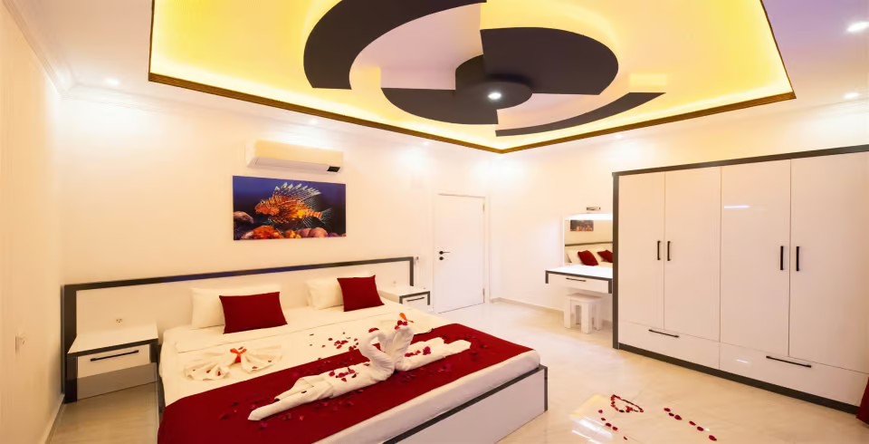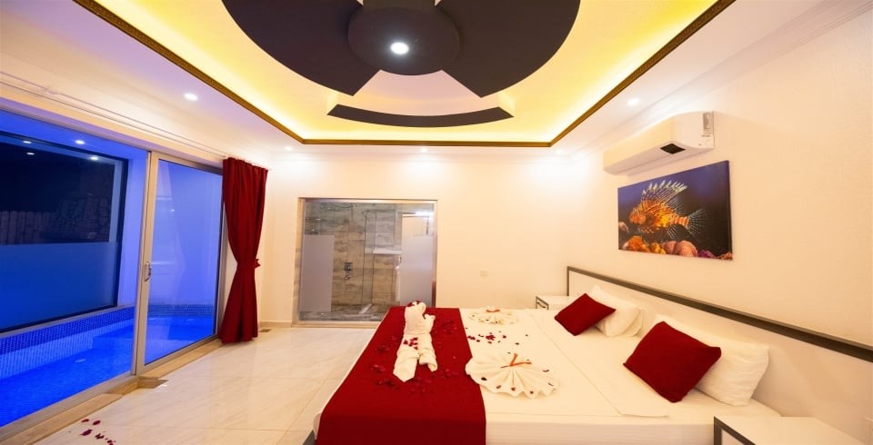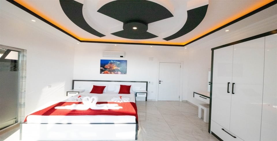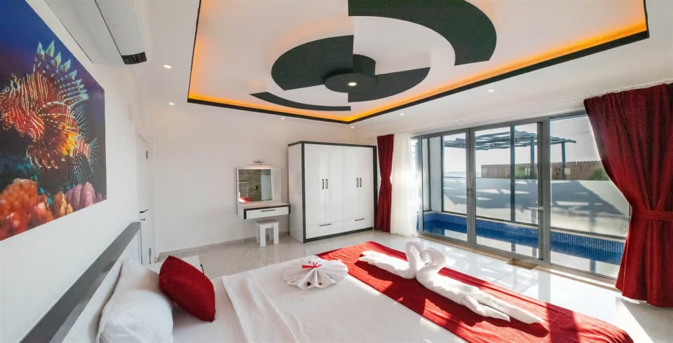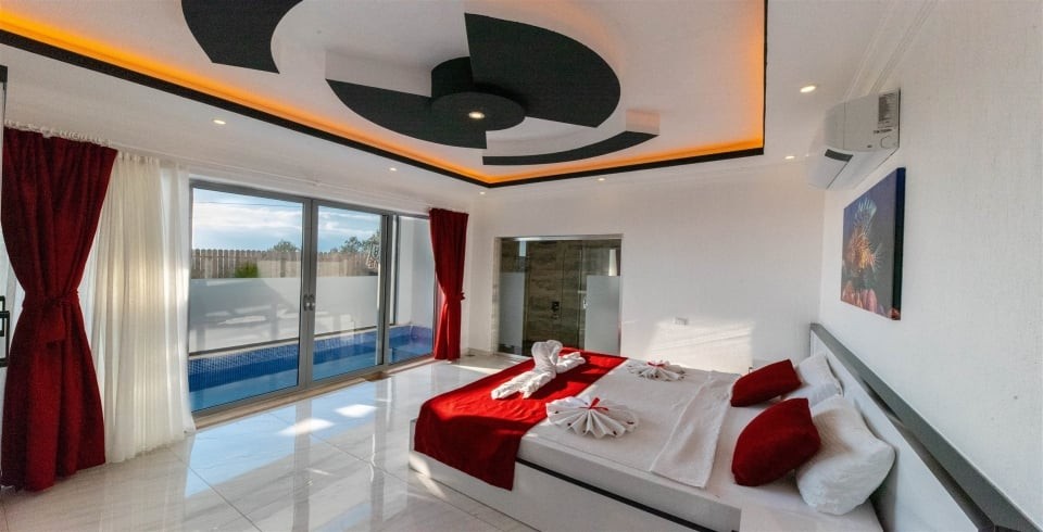 1. Yatak Odası : 1 adet çift kişilik yatak, klima, komodin, kapalı havuz, elbise dolabı, makyaj masası, banyo ve lavabo bulunmaktadır.