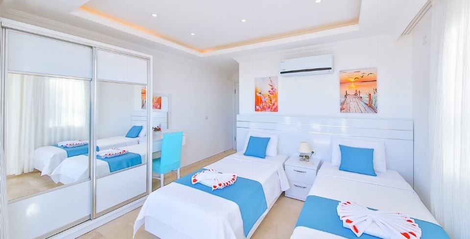 2. Yatak Odası : 2 adet tek kişilik yatak, klima, komodin, elbise dolabı, balkon, banyo ve tuvalet bulunmaktadır. Oda deniz ve doğa manzaralıdır.