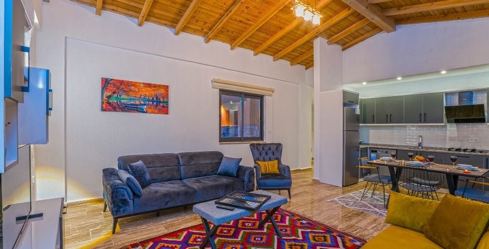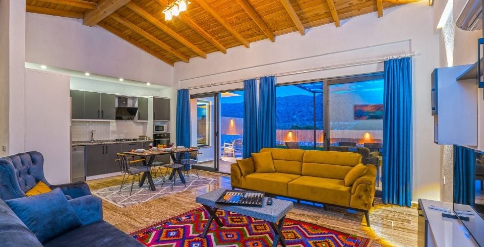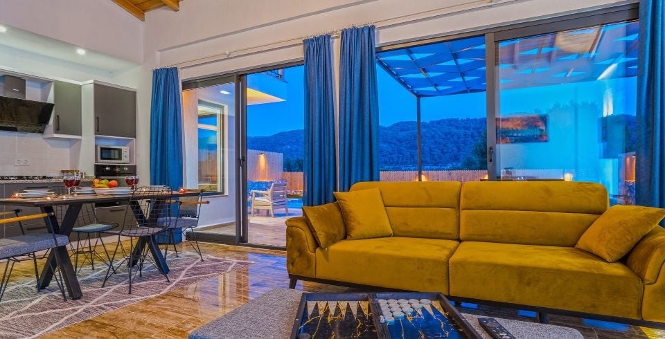 Salon: Villa salonunda konforlu oturma grubu, klima, TV, internet, uydu alıcı, yemek masası, sehpa bulunmaktadır.