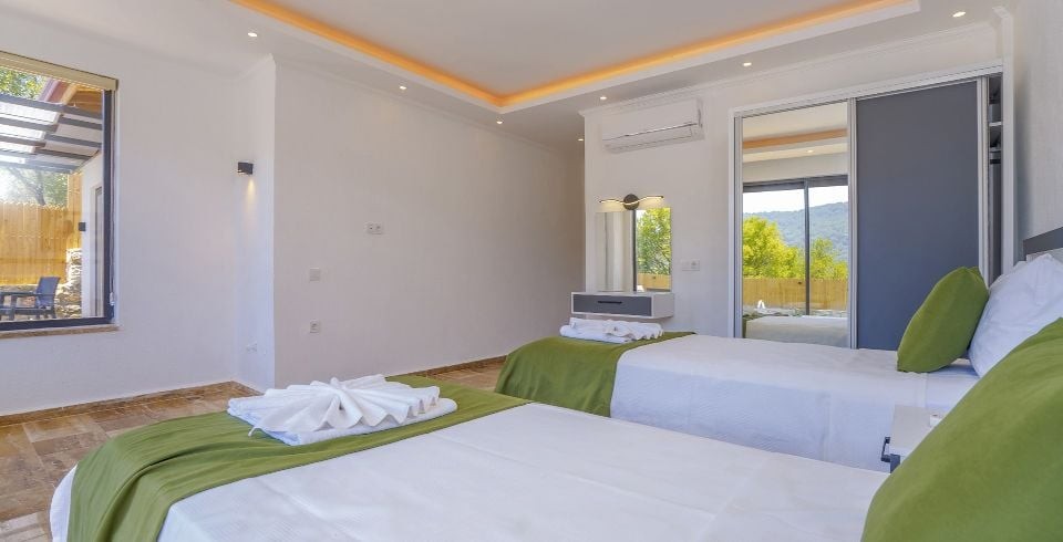 1. Yatak Odası: 2 adet tek kişilik yatak, klima, komodin, elbise dolabı, makyaj masası, banyo ve tuvalet bulunmaktadır.