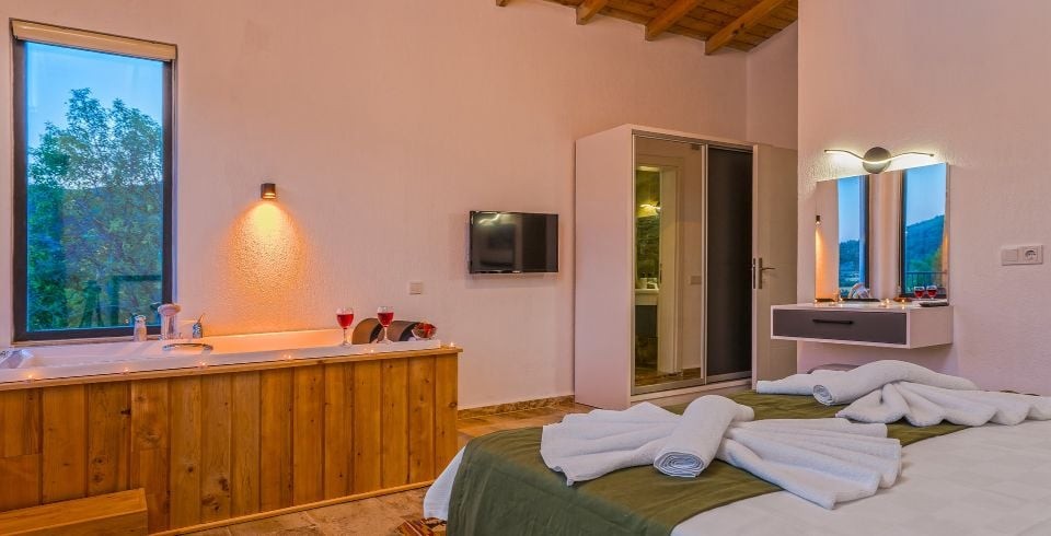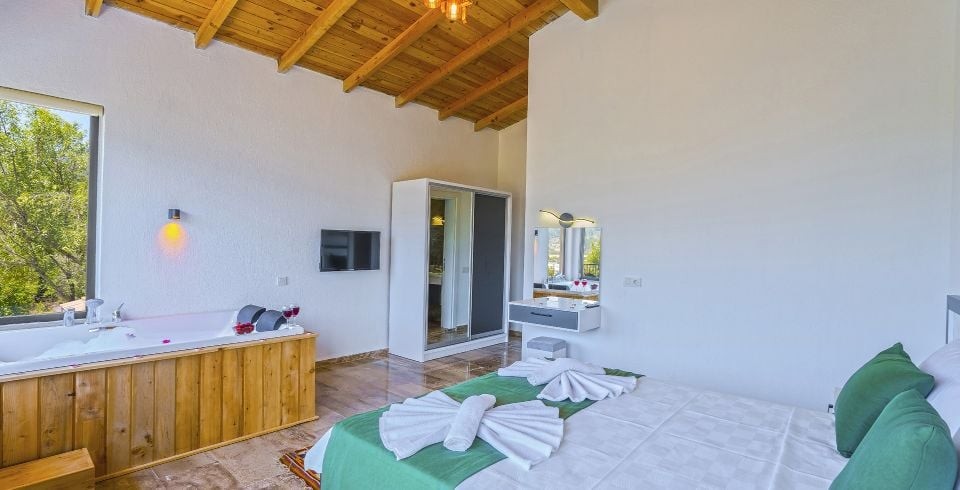 2. Yatak Odası: 1 adet çift kişilik, jakuzi ,klima, TV komodin, elbise dolabı, makyaj masası banyo ve tuvalet bulunmaktadır.