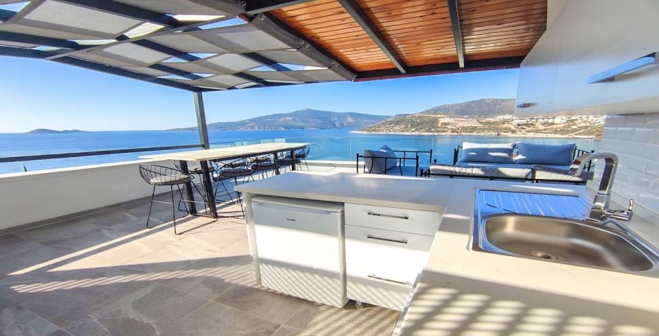 Açık plan salon ve tam donanımlı mutfak, geniş cam kapılarla havuz terasına açılır. Havuz terasında şezlonglar, oturma alanı ve barbekü bölümü bulunurken, 6,3 m x 4 m ölçülerinde özel yüzme havuzu tatilinize keyif katar. Villanın üst katında yer alan çatı terası, panoramik manzarayı izlemek ve akşam serinliğinde dinlenmek için ideal bir alandır.