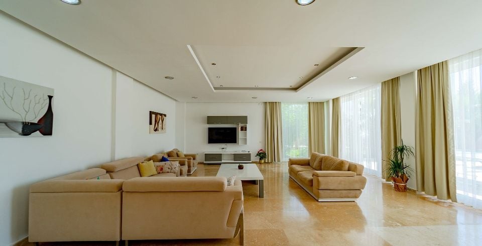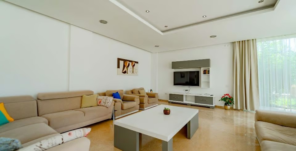 Salon : Villamızın geniş ve ferah salonunda oturma grubu, TV, uydu, internet, klima, 10 kişilik yemek masası, lavabo bulunmakta olup havuz terasına çıkış yapılabilmektedir.
